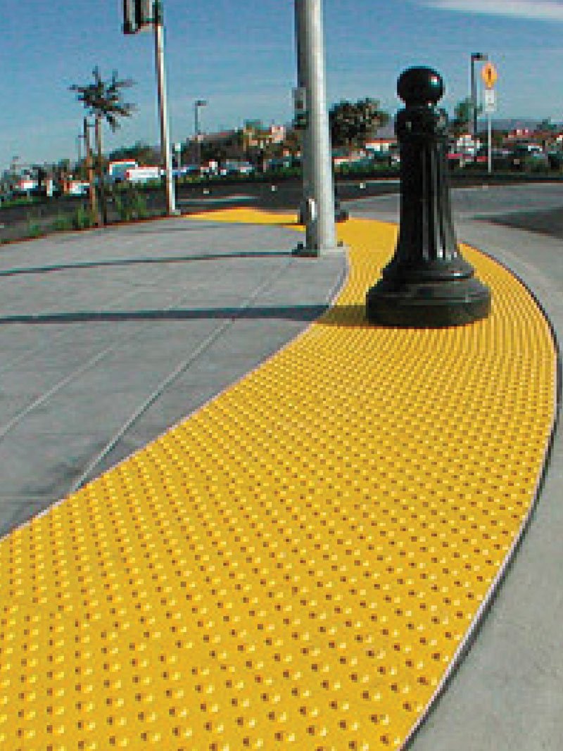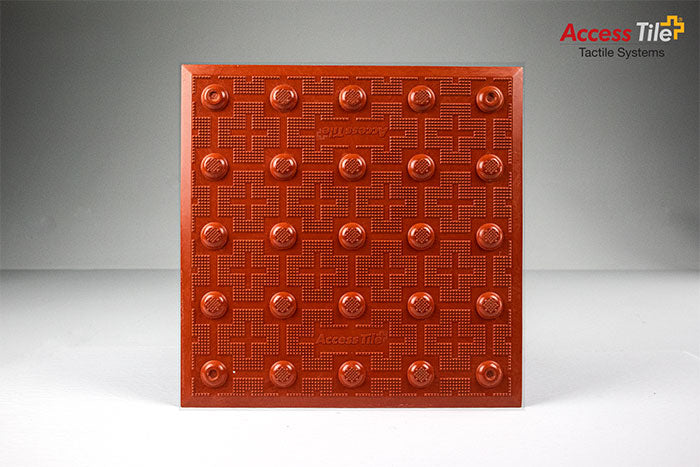 Surface mount ADA tiles, like those made by Access Tile, are detectable warning surfaces designed to alert visually impaired pedestrians of transitions from sidewalks to streets or hazardous areas. These tiles feature a grid of truncated domes that can be felt underfoot and detected by a cane, ensuring ADA (Americans with Disabilities Act) compliance.