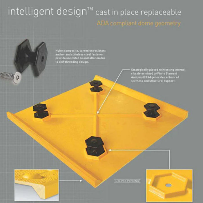 Each Cast in Place mat is set into the concrete while its wet. The benefit of this style of truncated dome mats are that they can be easily replaced in minutes by using a Torx wrench and unscrewing any damaged panels.
